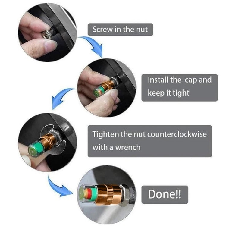 4. How to use: Unscrew the original air cap and screw on the tire pressure cap of this product. When it is not tightened or the tire pressure is insufficient, it will display red or yellow. After tightening, it will display green when the tire pressure is normal.