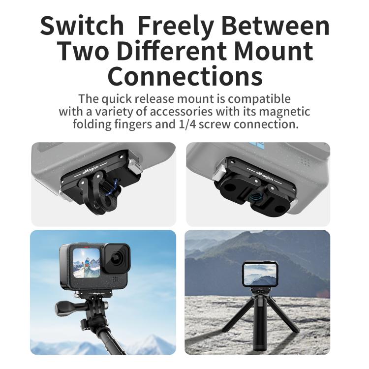 4. The bottom of the quick release accessory is equipped with both a magnetic two-claw interface and a 1/4-inch threaded interface, allowing it to be combined with various sports accessories for diverse usage scenarios.