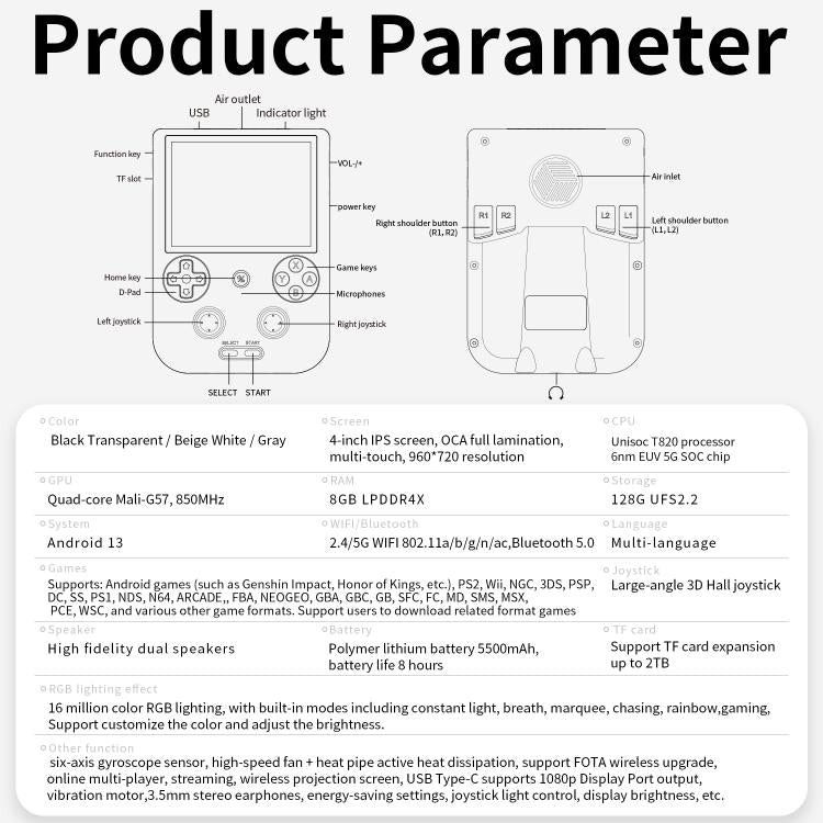 14. Other functions: six-axis gyroscope sensor, high-speed fan + heat pipe active cooling, support FOTA wireless upgrade, online fighting, streaming, wireless screen projection, Type-C supports 1080p DisplayPort output, vibration motor, support 3.5mm stereo headphones, energy saving settings, joystick light control, display brightness and other functional attributes display and free setting