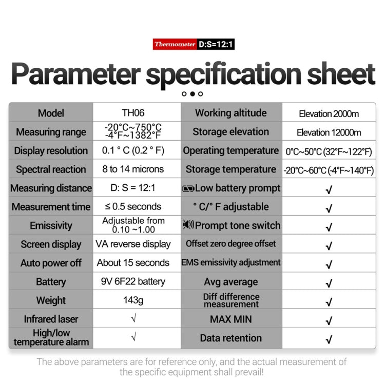 3. Object-to-object ratio 12:1, data retention, adjustable emissivity, mute switch, automatic shutdown, low battery reminder