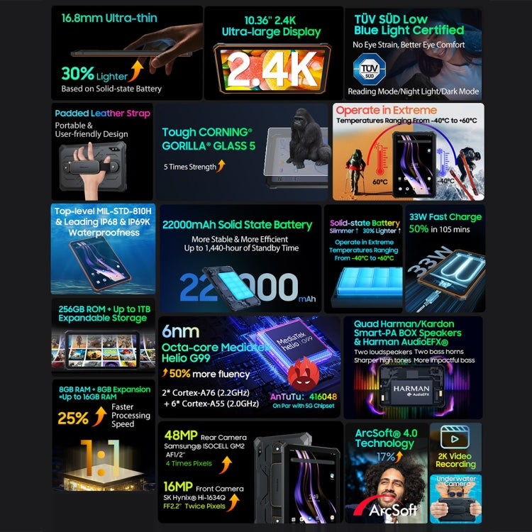 Blackview Active 8 Pro 4G Rugged Tablet, 10.36 inch 8GB+256GB Android 14 MT6789 Octa Core Support Dual SIM, Global Version with Google Play, EU Plug, Active 8 Pro