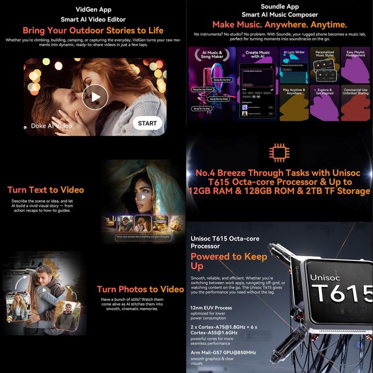 1. CPU: Unisoc UMS9230E T615, octa-core, 2 x A75 1.8GHz + 6 x A55 1.6GHz; GPU: Arm Mali-G57 core 850MHz