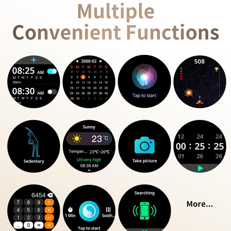 2. Function: Bluetooth calling, Bluetooth music playing, multi-sports mode, massive dial, five UI menu styles, AI voice assistant, password protection, business card, payment code, raising hand, brightening screen, Heart rate, pressure, sleep monitoring, blood oxygen, womens health, respiratory training, brightness level, do not disturb mode, time display, news, Alarm clock, weather, remote photography, looking for mobile phone (connected to mobile phone), stopwatch, timer, world clock, calculator, calendar, drainage, games.
