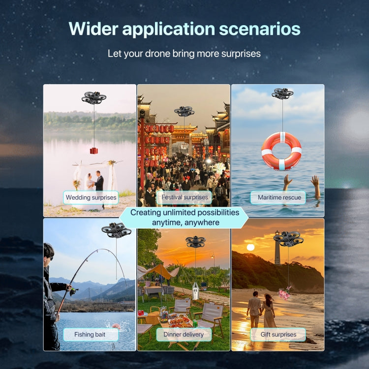 1. Exclusive design. The dedicated dispenser designed for DJI Avata 2 can be controlled by the remote control to rotate in place, so as to drop items;