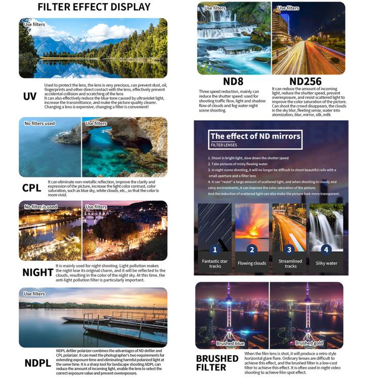3. ND Filter: You can get more freedom to control aperture and shutter, bring more exposure methods and creative space for photography creation, and effectively prevent overexposure. The number behind ND represents the ability of the ND mirror to block light.