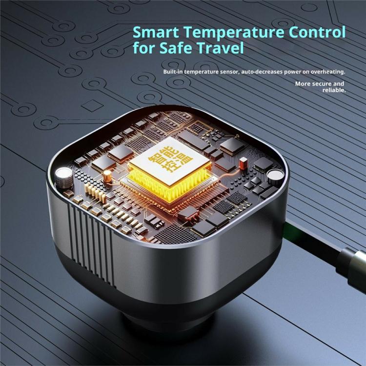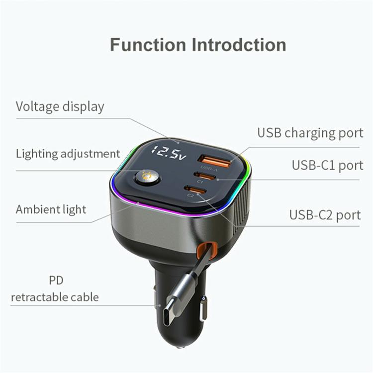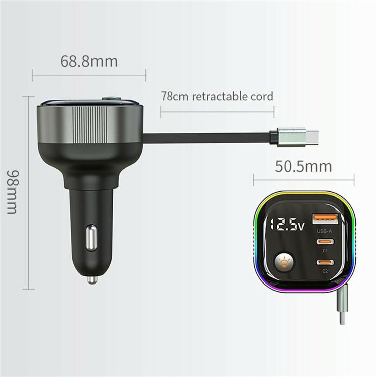 GE03 PD 65W Fast Charging Adapter Retractable Cable and Ambient Light Voltage Display Car Charger