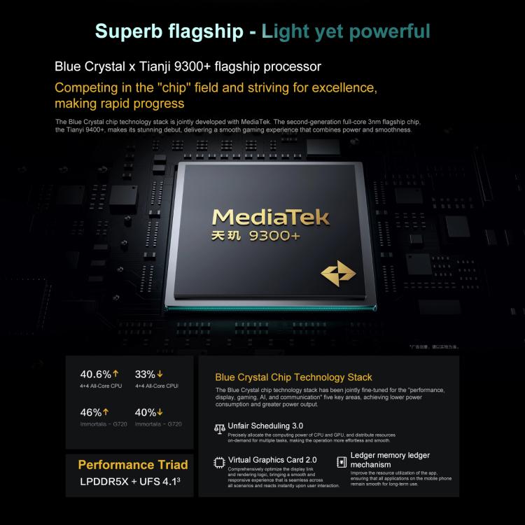 4. CPU: MediaTek Dimensity 9300+ Octa Core (1 x Cortex-X4 3.4GHz + 3 x Cortex-X4 2.85GHz + 4 x Cortex-A720 2.0GHz)