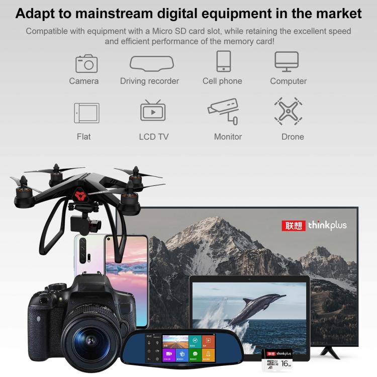 6. Applicable devices support TF card: smart phone, driving recorder, digital camera, car navigation, surveillance camera, tablet PC, drone, speaker, sports camera, laptop, etc.