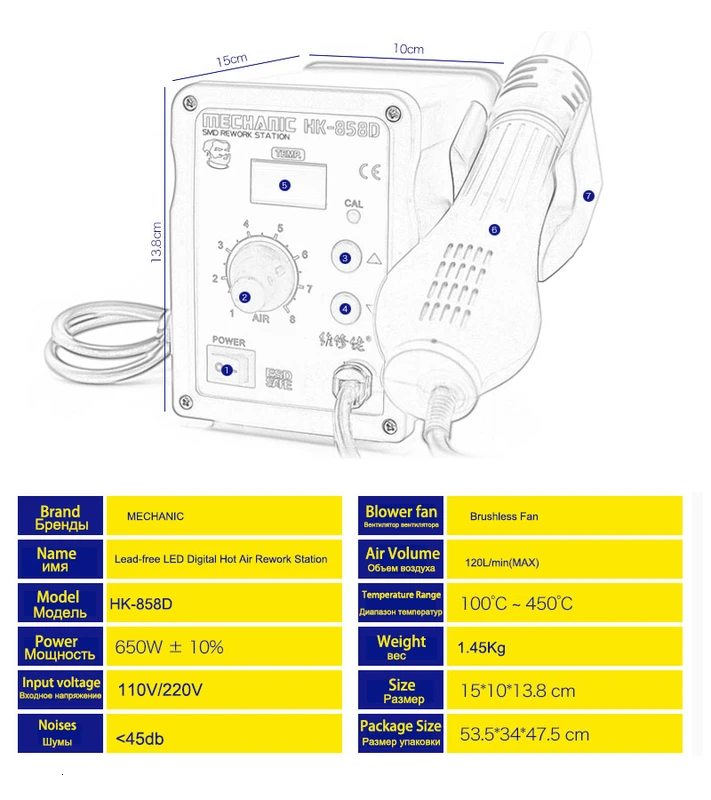 MECHANIC 110V/220V 650W brushless fan soft Lead-free LED Digital HK-858D SMD Hot Air Rework Station Solder Blower Heat Gun