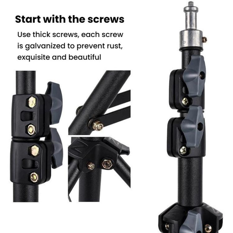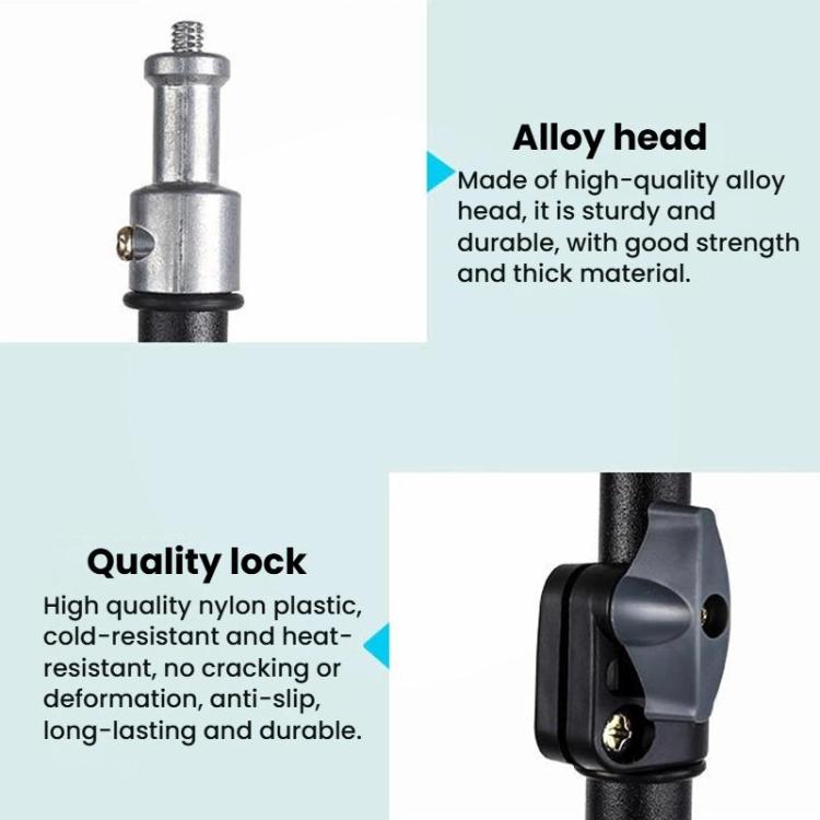 8. 1/4 inch screw interface, enhances the expandability and practicality of the lamp stand. It can accommodate devices with 1/4-inch interface such as pan-tilt heads, cameras, phone holders, studio lights, lamp holders, ceiling lamp stands, and flashlights, making it highly versatile