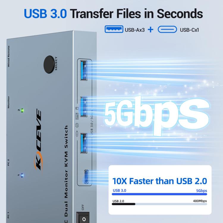This USB-C KVM switch supports dual-monitor output, allowing two USB-C laptops to share dual monitors and four USB 3.0 devices, such as keyboards, mice, hard drives, flash drives, and printers. It supports mirroring and extended modes.
