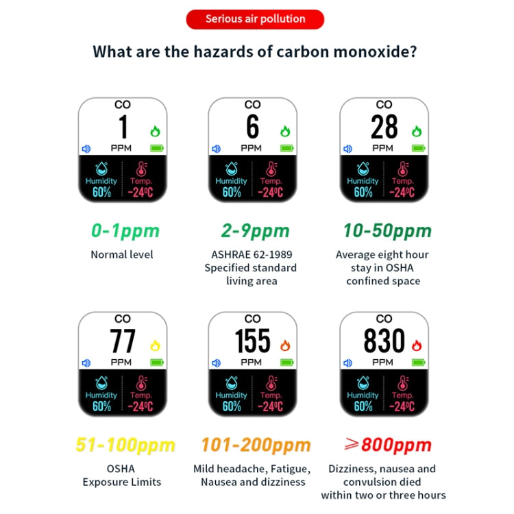 14. It can not only detect the carbon monoxide concentration in the environment, but also detect the temperature and humidity in the indoor air. It can be used as a thermometer and hygrometer at ordinary times