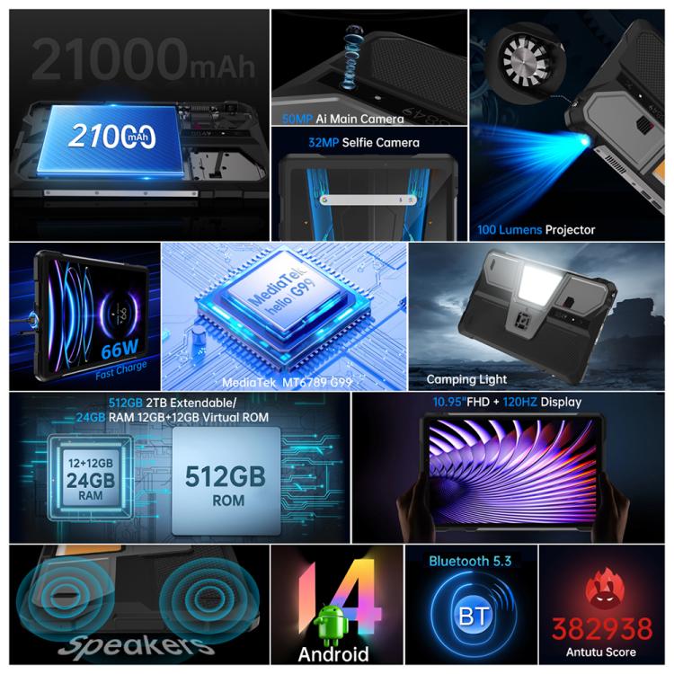 Unihertz 8849 Tank Pad E Rugged Tablet PC & Projector, 12GB+512GB, 10.95 inch Android 14 MT6789 Octa Core 4G Network, EU Plug, Tank Pad E 4G Network