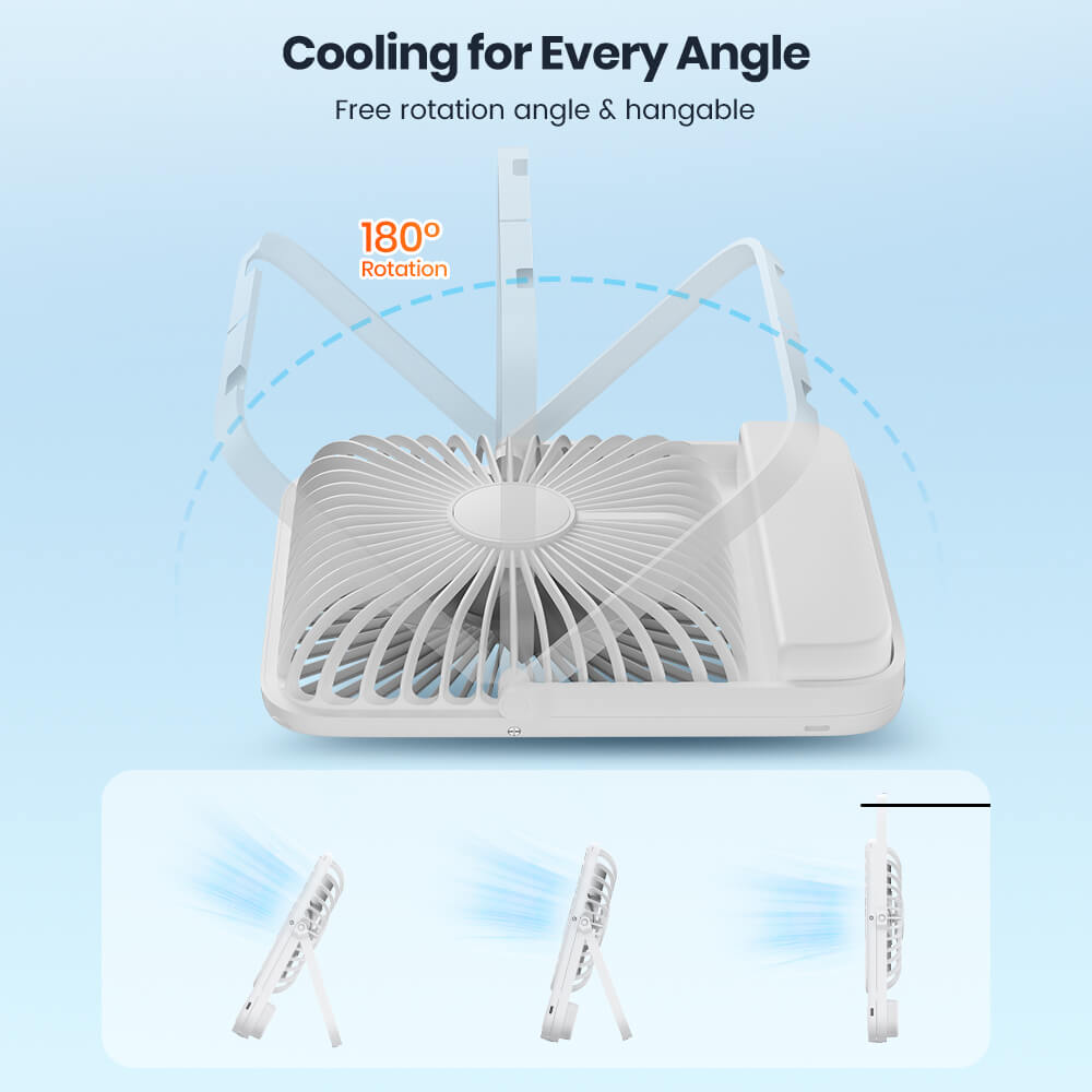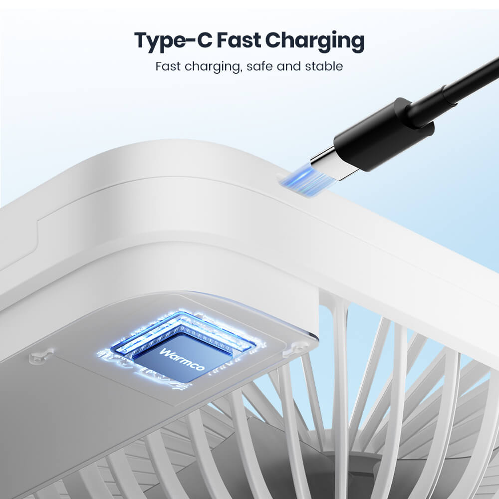 USB-C port supports charging fan and devices simultaneously; includes 2-in-1 charging cable.