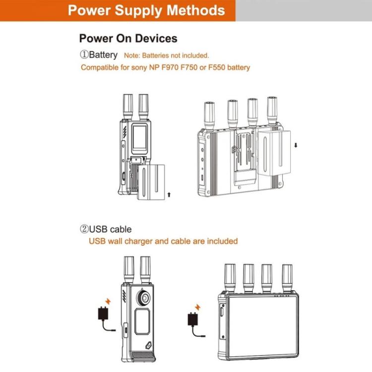 7.Flexible Power Options:Compatible with NP-F (970/750/550) batteries, 5V/2A DC power supply, or USB-C power banks for versatile powering solutions.