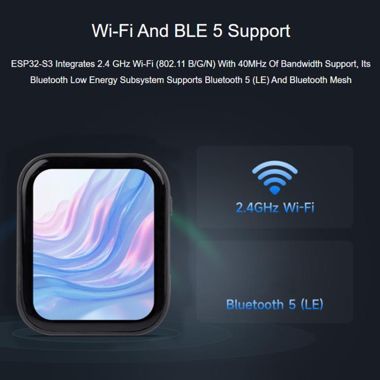 3. Supports 2.4GHz Wi-Fi (802.11 b/g/n) and Bluetooth 5 (LE), with an onboard antenna.