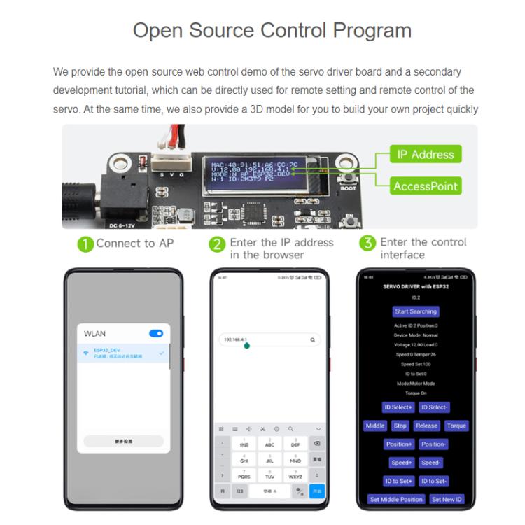 23. We have open-sourced the web-based control example for the servo motor driver board and provided a secondary development tutorial, which can be directly used for remote setting and control of the servo motor. We also provide 3D models for quick project development.