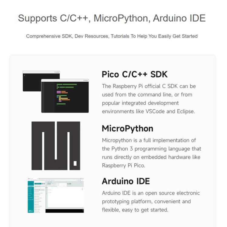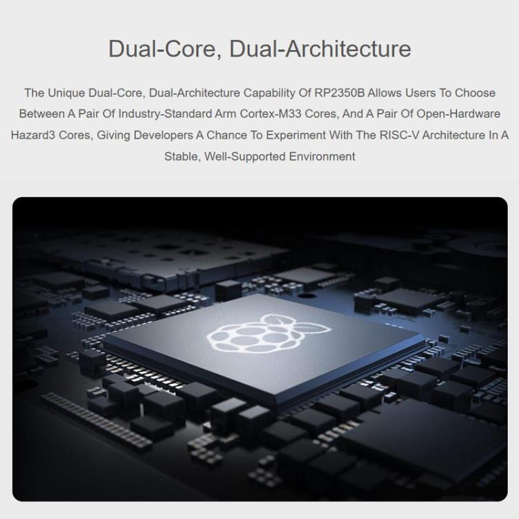2. Unique dual-core, dual architecture, equipped with a dual-core ARM Cortex-M33 processor and dual-core Hazard3 RISC-V processor, clock running frequency are up to 150MHz, to support the flexibility of switching between the two architectures