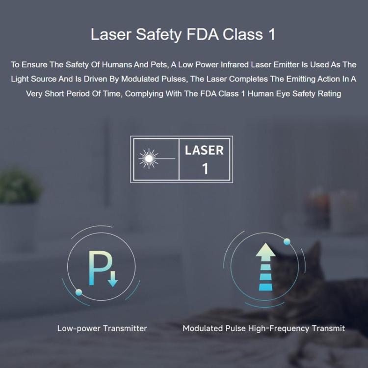 9. To ensure the product’s safety for humans and pets, a low-power infrared laser emitter is used as the light source, driven by a modulated pulse method. The laser emits only for an extremely brief duration, complying with FDA Class 1 eye safety standards