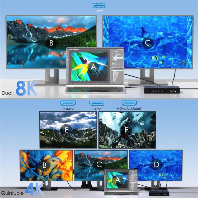 1.Dual 8K or Five 4K Displays:Supports up to 2x8K or 5x4K monitors via 2 DisplayPort 1.4 and 3 HD ports, perfect for multitasking, streaming, and productivity.