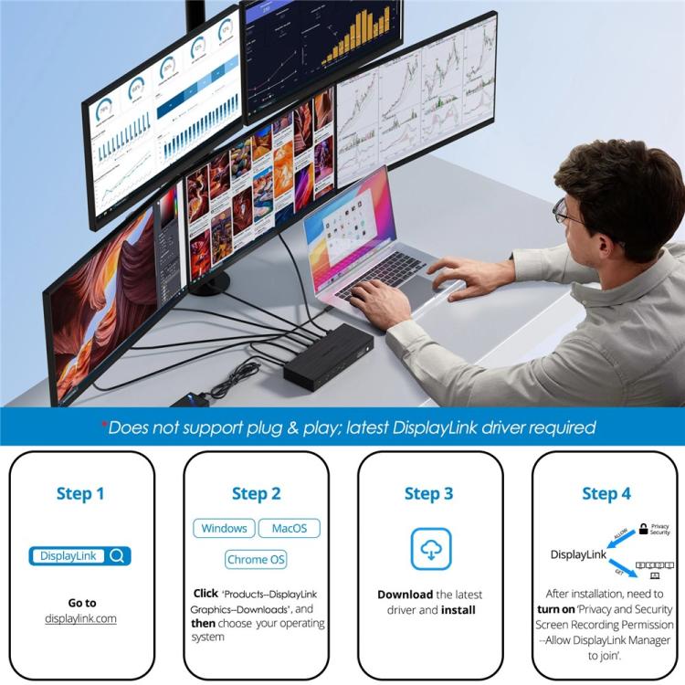 2.Not plug-and-play; driver installation is required. Please download the latest driver at displaylink.com.