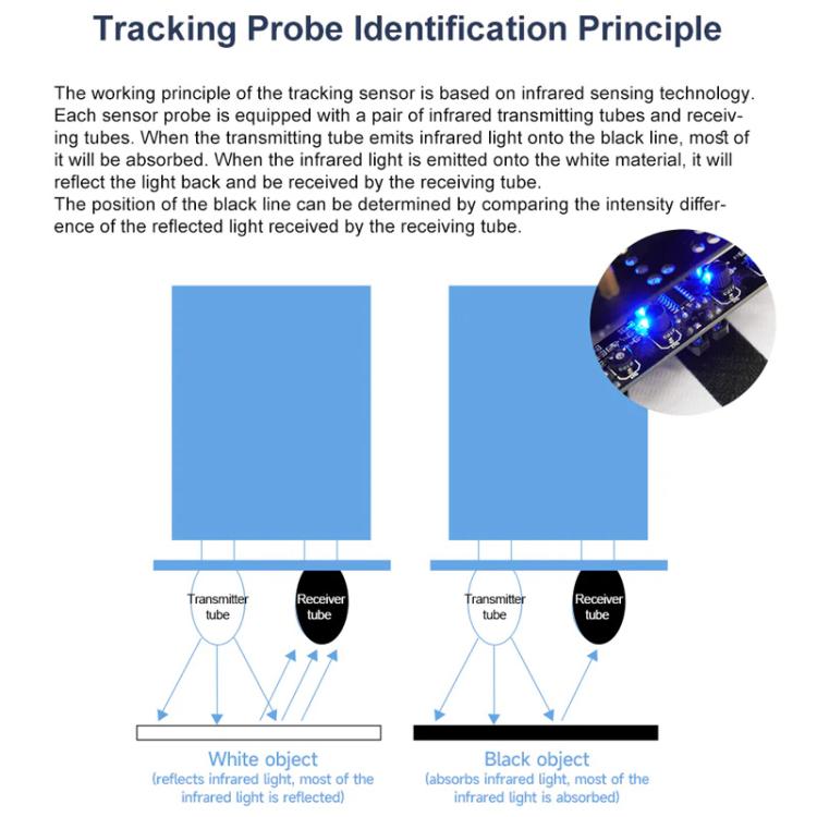 1. This tracking module uses four tracking probes and optimizes the spacing layout. The two inner probes can precisely identify the black lines, while the two outer probes can assist the inner probes in identifying the black lines and provide warnings. The vehicle can recognize 90-degree turns and other complex road surfaces.